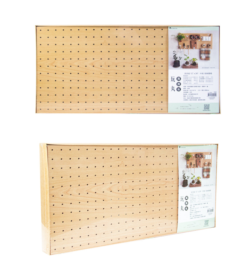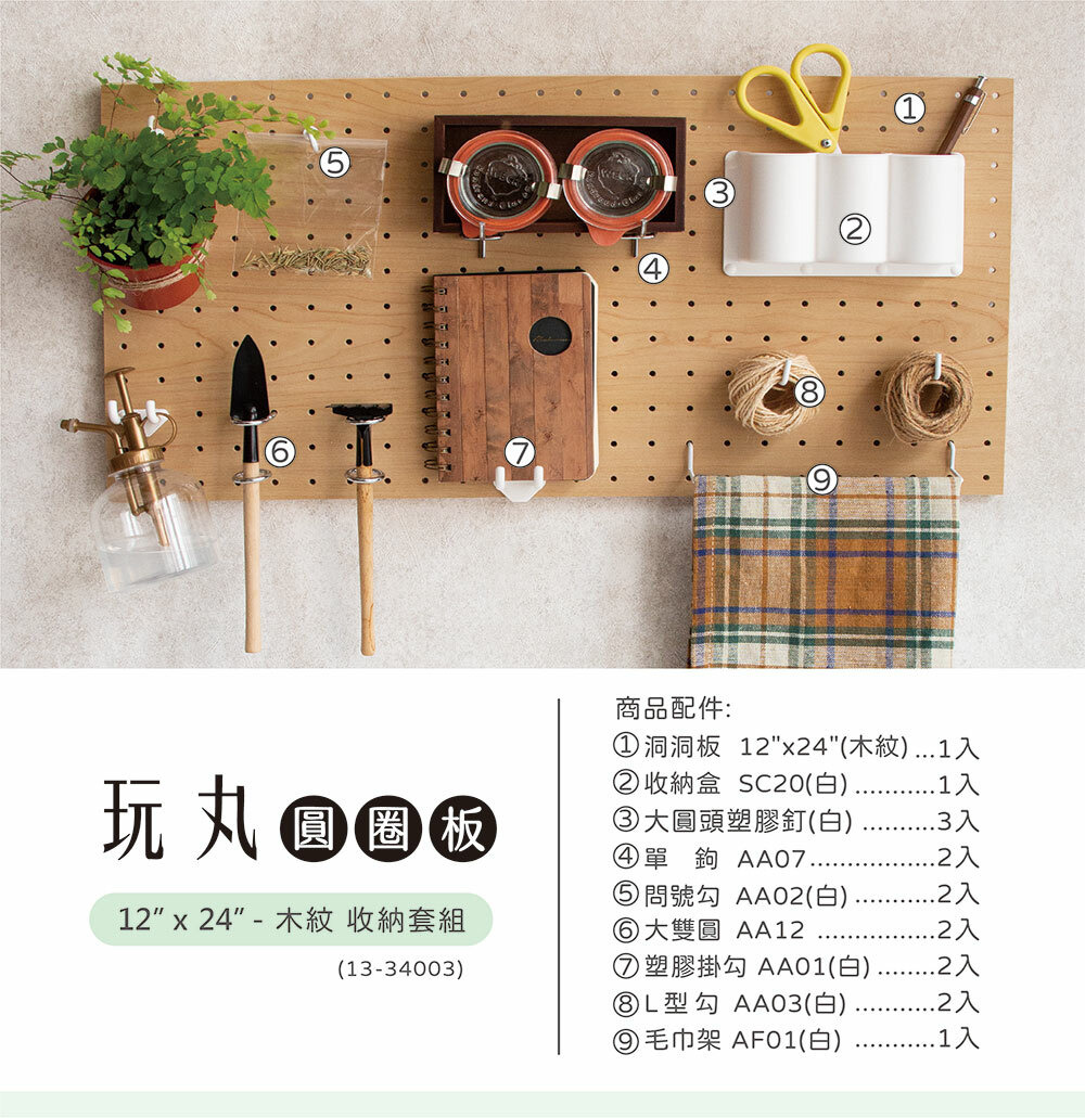 玩丸圓圈板 洞洞板〔12"x24"〕寬30長60cm 木紋-收納套組 (9件組)_13-34003