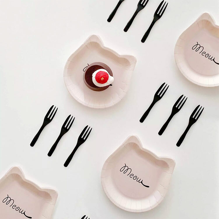 蛋糕盤叉組 無淋膜 小貓盤+黑叉 (18組)_15-T040202-1